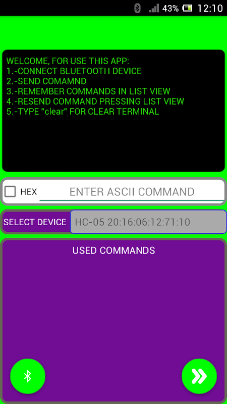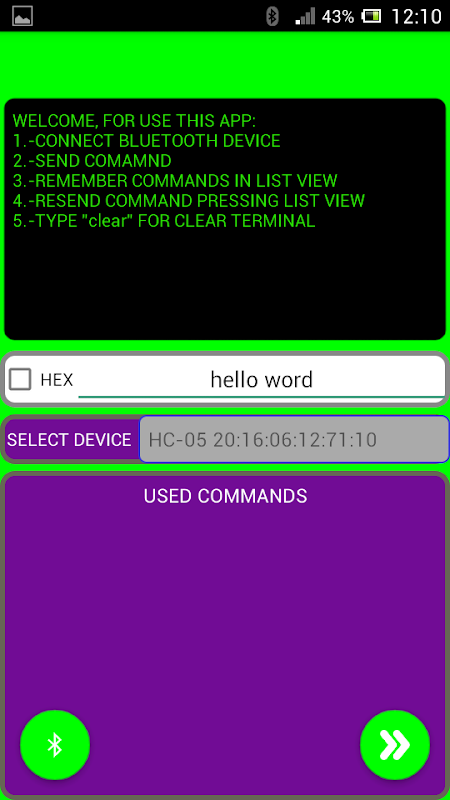 BLUETOOTH TERMINAL, EASY TO USE, REMEMBER THE COMMANDS, SEND HEX COMMANDS