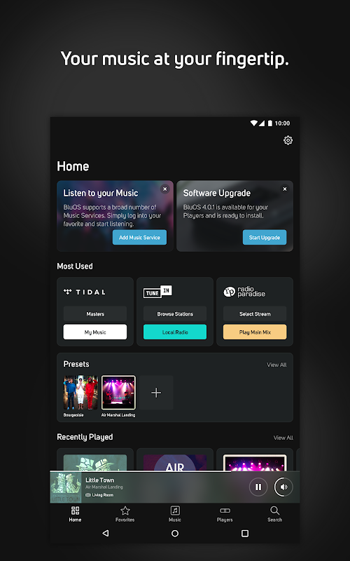 Available for Android devices, the BluOS Controller app is everything you need to set up, control and listen to your music on a BluOS-enabled wireless music system.