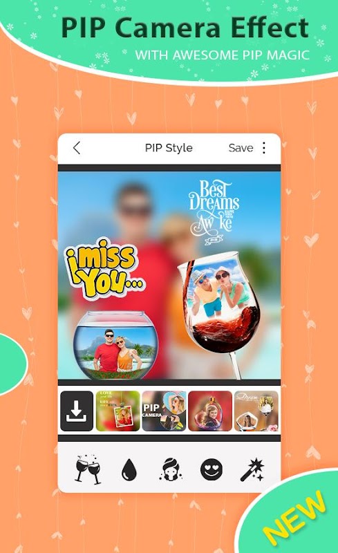 PIP CAM - Photo Maker contains the wide range of funny stickers and has various custom fonts to write on your photo. Stickers and text will help you out to show your emotions with the photo. On the celebration photo you can write tag your friends with funny stickers. PIP camera photo editor has online library to download more stickers.