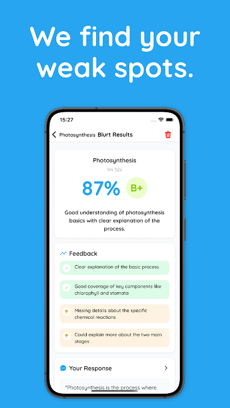 Once you’re ready, blurt — speak or type everything you remember about the topic. Blurt’s AI compares your response to the original material, highlights what’s missing, and gives you a score based on how complete your answer is.