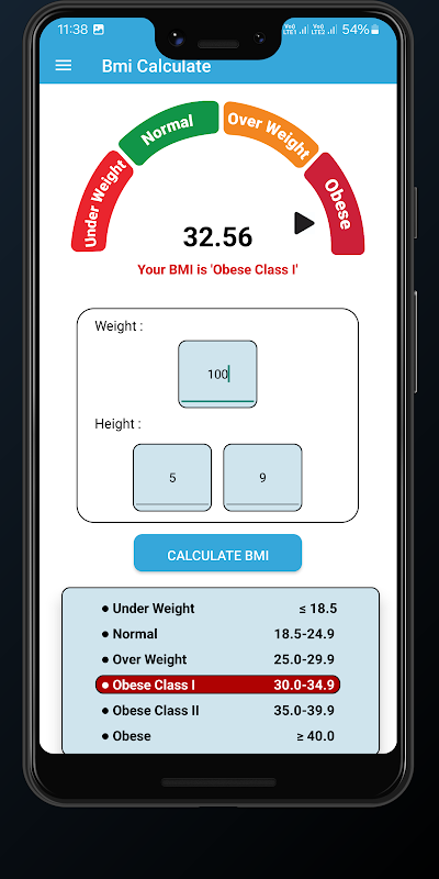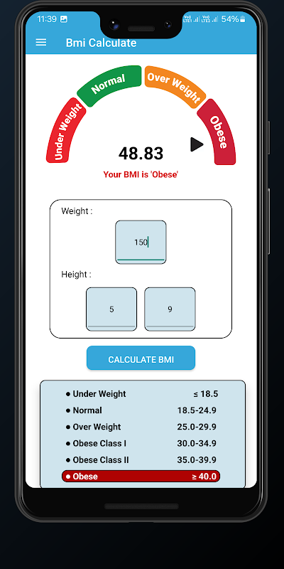 Our health made easy with the BMI Calculate app! Quickly find out your Body Mass Index (BMI) by inputting your height and weight. Instantly determine if you’re underweight, at a healthy weight, overweight, or in the obesity category.