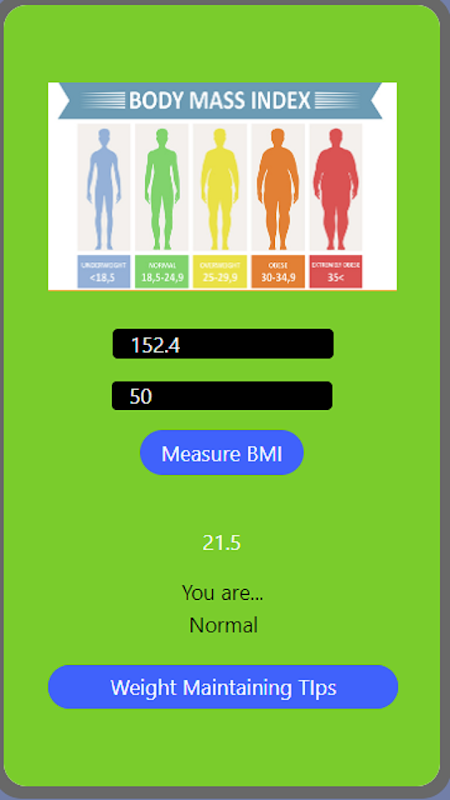 The app will ask your body height and weight, then it will calculate if your BMI is normal, too low or too high. Depending on the result, it will also give you different tips to improve or maintain your current physical condition.