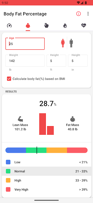 - Body fat percentage calculator suitable for both men and women