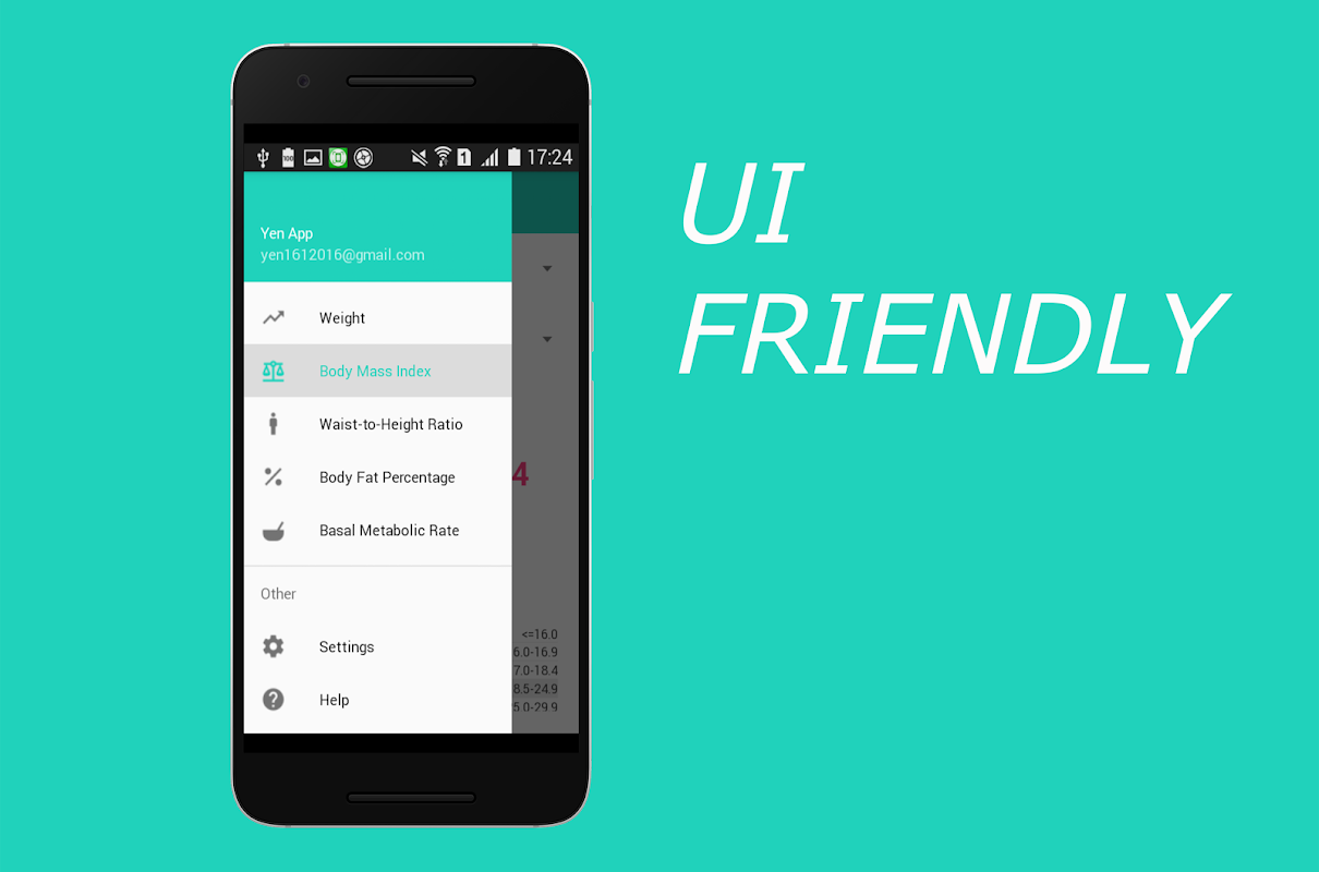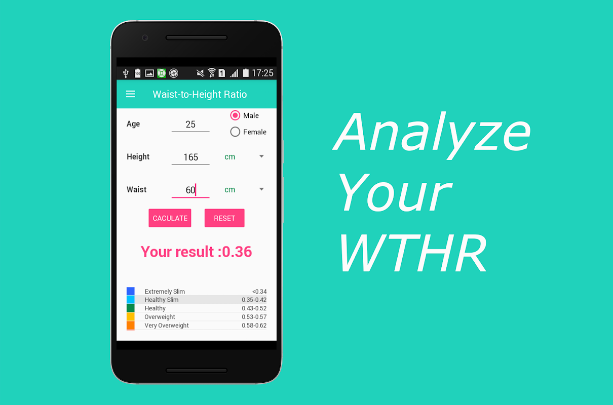BMI Calculator is an application to determine your BMI , Waist to Height Ratio , Body fat percentage and Basal metabolic Rate . You also can manage your weight diary by date , save input and output automatically .