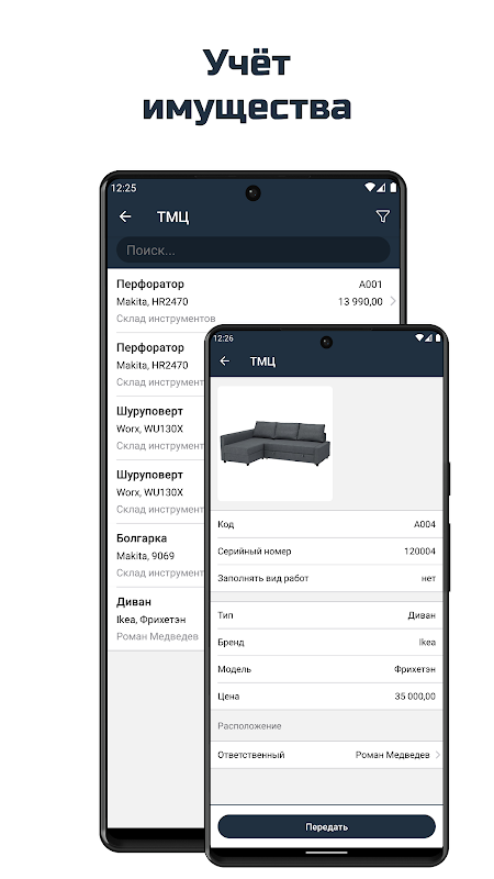 একটি সুবিধাজনক ইন্টারফেস এবং বারকোড এবং এনএফসি ট্যাগ স্ক্যান করার কার্যকারিতার জন্য ধন্যবাদ, আপনি যে কোনও কর্মচারীর নিষ্পত্তিতে বা একটি নির্দিষ্ট গুদামে অবস্থিত সমস্ত সম্পত্তি দ্রুত এবং দক্ষতার সাথে গণনা করতে পারেন।