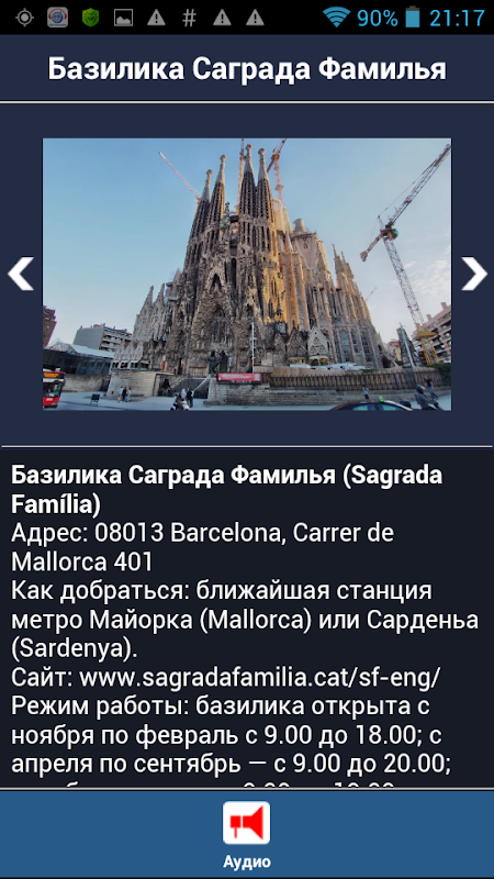 ● বার্সেলোনার অডিও গাইড। অডিও গাইডের বর্ণনাটি একটি রেকর্ডিং স্টুডিওতে একজন পেশাদার বর্ণনাকারীর কণ্ঠে দেওয়া হয়েছে। বর্ণনাটি শোনা আপনাকে দর্শনীয় স্থান পরিদর্শনের সময় বিক্ষেপ, সময় নষ্ট এবং ছোট পর্দায় লেখা পড়ার মাধ্যমে আপনার দৃষ্টিশক্তির ক্ষতি এড়াতে সাহায্য করবে।