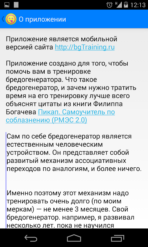 এই অ্যাপ্লিকেশনটি প্রশিক্ষণ bredogeneratora মধ্যে আপনাকে সাহায্য করবে। ফিলিপ Bogachev বইটি থেকে নেওয়া ব্যায়াম বর্ণনা, "পিক। ব্য (RMES 2.0) উপর Camouchitel"