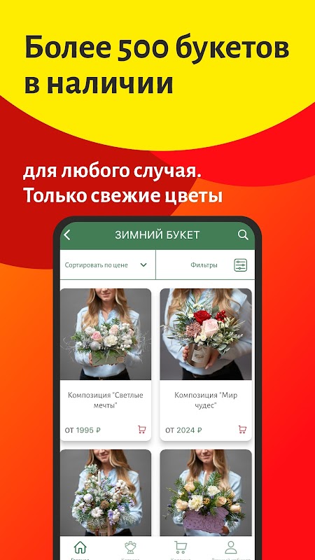 • নতুন গ্রাহকদের জন্য ফুলের জন্য উপহার হিসাবে 500 রুবেল। অ্যাপ্লিকেশনটিতে নিবন্ধন করুন এবং 500 রুবেল বোনাস পান।