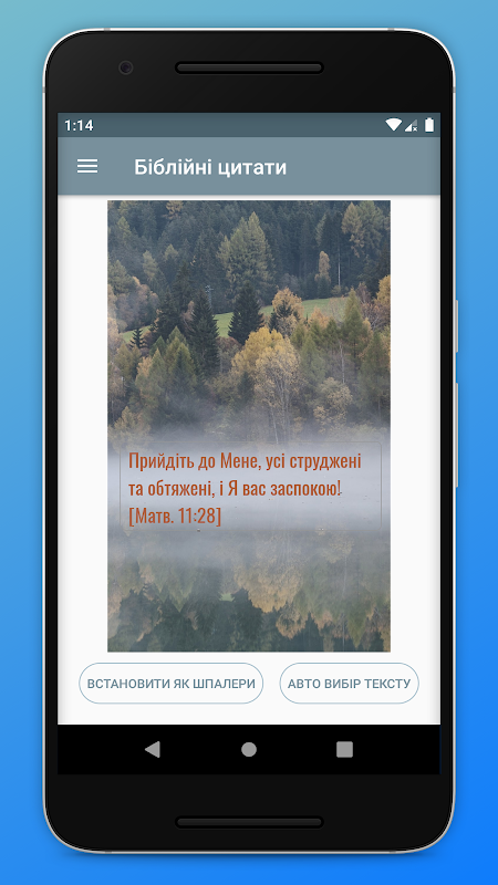 অ্যাপ্লিকেশনটি আপনাকে কয়েক সেকেন্ডের মধ্যে বাইবেল থেকে উদ্ধৃতি সহ একটি ব্যাকগ্রাউন্ড চিত্র তৈরি করতে এবং একটি ওয়ালপেপার হিসাবে এটি ইনস্টল করতে দেয়।