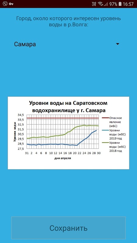 পাঁচটি শহরের সংশ্লিষ্ট জলাশয়ে ভলগা নদীর জলের স্তরের গ্রাফ সহ একটি উইজেট প্রদর্শনকারী একটি অ্যাপ্লিকেশন: সামারা, সারাতোভ, সিজরান, টোগলিয়াতী, উলিয়ানভস্ক।