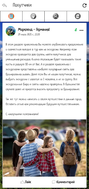 এমন পরিস্থিতি আছে যখন আপনি একা বা একটি দম্পতি ভ্রমণ করছেন এবং আপনি একটি আকর্ষণীয় ভ্রমণে যেতে চান, কিন্তু এটি ব্যয়বহুল, কারণ গাইড একটি গ্রুপ ফি নেয়। এই অ্যাপ্লিকেশনে, আপনি যৌথ ভ্রমণের জন্য সহযাত্রীদের খুঁজে পেতে পারেন, এবং সফরের খরচ কমাতে পারেন। অ্যাপ্লিকেশনের "সহযাত্রী" বিভাগে, আপনার পোস্টটি প্রকাশ করুন এবং এটি 10 কিলোমিটারের ব্যাসার্ধের মধ্যে অ্যাপ্লিকেশনটির অন্যান্য ব্যবহারকারীদের কাছে দৃশ্যমান হবে। এবং যখন আপনি "ভূতাত্ত্বিক অবস্থান" আইকনে ক্লিক করেন, আপনি নিজেই আপনার কাছ থেকে 10 কিলোমিটার ব্যাসার্ধের মধ্যে এরকম অন্যান্য অফার দেখতে পারেন! অতিরিক্তভাবে, অ্যাপ্লিকেশনটিতে, আপনি জার্মানির শহরগুলির সাথে প্রাথমিক পরিচিতি তৈরি করতে পারেন, দর্শনীয় স্থান এবং ভিডিও পর্যালোচনা দেখে ভ্রমণের জন্য একটি জায়গা চয়ন করতে পারেন। অ্যাপ্লিকেশনটিতে সফর সংস্থা, ট্রাভেল এজেন্সি এবং নির্বাচিত শহরে তাদের পরিষেবা প্রদানকারী হোটেল সম্পর্কে তথ্য রয়েছে।