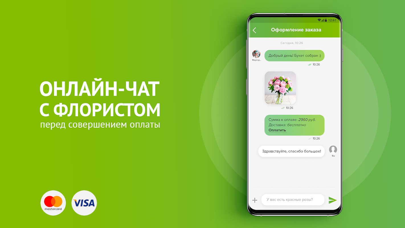 Получателю не обязательно знать, сколько стоил букет: оплатите его картой в приложении. А любители наличных всегда могут заплатить за букет курьеру при доставке.