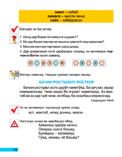 Шумо баъд аз хатми синфи якум як зина боло, ба синфи дуюм қадам ниҳодед. Агар имсол ҳам хубу аъло хонед, дар роҳи дониш як дам бапеш мегузоред. Орзуи мо, азизон, ин аст, ки ҳама фанҳоро нағз омузед, ба сухану насиҳатҳои муаллими меҳрубон ва падару модарон гуш кунед. Ҳамаи одамони калонсол ба шумо умри дароз, тансиҳати ва дар таҳсилатон муваффакият мехоҳанд. Мехоҳанд, ки шумо калон шавед, соҳиби маълумот гардед, ба падару модар ва ҳам Ватани азизамон хизмат кунед. Ин китоб барои шумо навишта шудааст. Хонед ва аз панду ҳикматҳояш баҳра манд гардед. Онро покиза нигоҳ доред. Фаромуш накунед, ки соли оянда ин китобро хоҳар ё додарони шумо мехонанд.