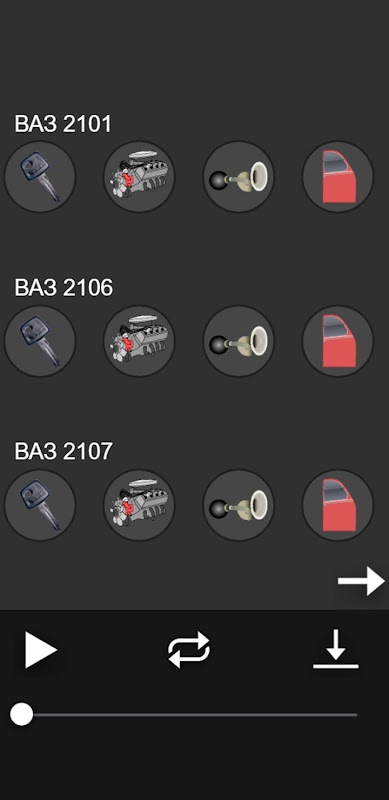ভিএজেড গাড়ি সাউন্ড। অ্যাপ্লিকেশনটি ঘরোয়া গাড়িগুলির সর্বাধিক জনপ্রিয় মডেলগুলি যুক্ত করেছে, যার মধ্যে আপনি ইঞ্জিনের শব্দ, ইগনিশন, দরজা খোলার এবং খোলার পাশাপাশি এলএডিএ গাড়িগুলির মূল সংকেত শুনতে পাচ্ছেন।