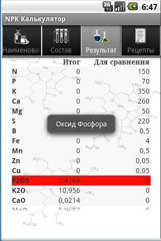 В программе присутствует «NPK Калькулятор» для расчета удельного веса химического элемента в растворе. Присутствует возможность накопления рецептов растворов и их быстрый поиск, а также привязка рецепта к конкретному растению.