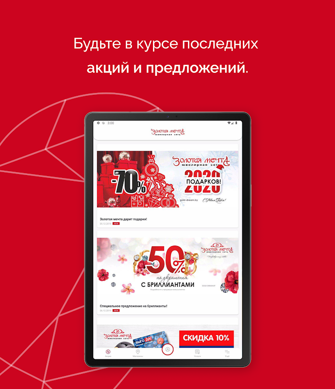 Высокий уровень обслуживания, постоянное обновление ассортимента, фирменная узнаваемость, построенная на стильном контрасте красных и черных тонов. Каждый салон сети «Золотая мечта» — воплощение современного дизайна, гарантия индивидуального подхода и исполнение Вашей мечты!