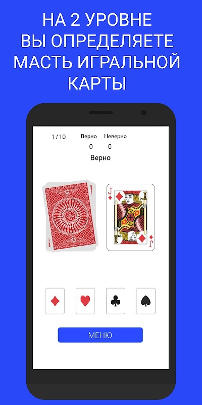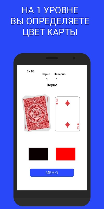 আমরা চারটি অনুশীলন তৈরি করেছি - এটি একটি মস্তিষ্ক প্রশিক্ষণ অনুশীলন "কালো বা লাল কার্ড অনুমান করুন"। এছাড়াও, আরও জটিল অনুশীলন হ'ল স্যুটটি অনুমান করা, যেখানে সঠিক উত্তরটি চারটির মধ্যে একটি হবে। তৃতীয় অনুশীলন হ'ল স্ট্যান্ড প্রাইস চার্টে মোমবাতিযুক্ত রঙটি কী হবে বা দাম যেখানে উপরে বা নিম্নে চলে যাবে তা চয়ন করা। এবং আরও কঠিন অনুশীলন - জেনার কার্ডগুলি, চারটি জেনার কার্ডের মধ্যে একটি অনুমান করুন।
