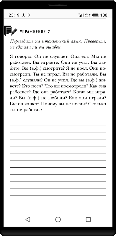 টিভি চ্যানেল "সংস্কৃতি" তে প্রচারিত জনপ্রিয় শিক্ষামূলক প্রোগ্রাম "পলিগ্লট" এর ভিত্তিতে প্রাথমিক ইতালীয় ভাষা কোর্স তৈরি করা হয়েছিল। বইটিতে অনুশীলন, মৌলিক উচ্চারণের নিয়ম এবং ক্রিয়া সম্পর্কে তথ্য রয়েছে। দিমিত্রি পেট্রোভের পদ্ধতি অনুসারে ষোলটি পাঠের সাহায্যে, আপনি ভাষার মৌলিক অ্যালগরিদমগুলি আয়ত্ত করতে পারেন, সেগুলি অনুশীলনে প্রয়োগ করতে পারেন এবং সেগুলি স্বয়ংক্রিয়তায় নিয়ে আসতে পারেন। যারা স্বাধীনভাবে পড়াশোনা করে তাদের সাহায্য করার জন্য, চাবির একটি সম্পূর্ণ সংগ্রহ দেওয়া হয়, যেমন অনুশীলন সম্পাদন। এখন পাঠকরা ব্যাকরণ নিয়ম সঠিকভাবে আয়ত্ত করেছেন কি না তা পরীক্ষা করতে এবং ভাষা শেখার প্রক্রিয়ায় প্রয়োজনীয় সমন্বয় করতে পারবেন।