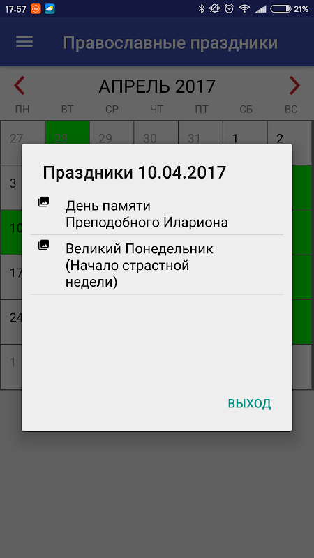অ্যাপ্লিকেশনটিতে একটি ক্যালেন্ডার রয়েছে যা আপনাকে আগ্রহের তারিখ নির্বাচন করতে এবং এই দিনে সমস্ত ছুটির দিনগুলি দেখতে দেয়।