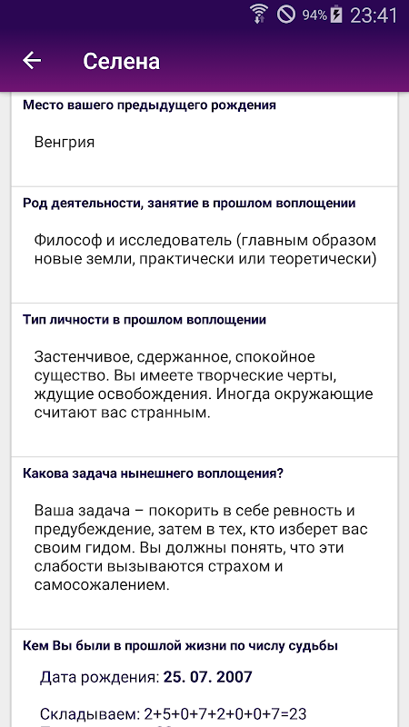 С помощью приложения "Кем был в прошлой жизни", Вы узнаете о прошлом воплощении по дате рождения. Узнать каким был в прошлом жизни человек, сможет дать ответы на многие вопросы, например Вы сможете понять от куда у Вас тяга каким либо определенным наукам или профессиям, может быть именно этот род деятельности, занятие в прошлом воплощении Вы выбрали, именно этим делом занимались в прошлой жизни.
