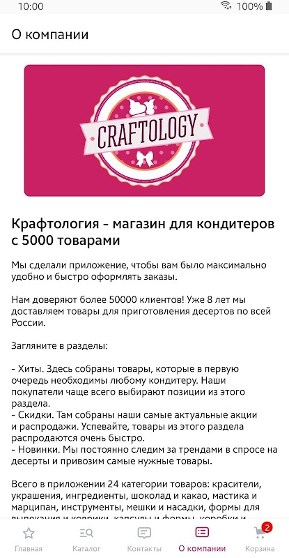 ক্র্যাফটোলজি - 5000 পণ্য সহ মিষ্টান্নগুলির একটি দোকান। আমরা অ্যাপ্লিকেশনটি তৈরি করেছি যাতে আপনি যথাসম্ভব সুবিধামত এবং দ্রুত অর্ডার দিতে পারেন।