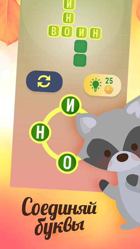 Соединяйте заданные буквы и находите слова: достаточно провести пальцем от одной буквы к другой, чтобы заполнить поле кроссворда. Игра отлично подходит для развития логики и расширения словарного запаса. Иногда ответы приходят сами собой, но если возникла сложность, то можно воспользоваться подсказкой. Получай монеты за прохождение уровней и выполнение заданий.