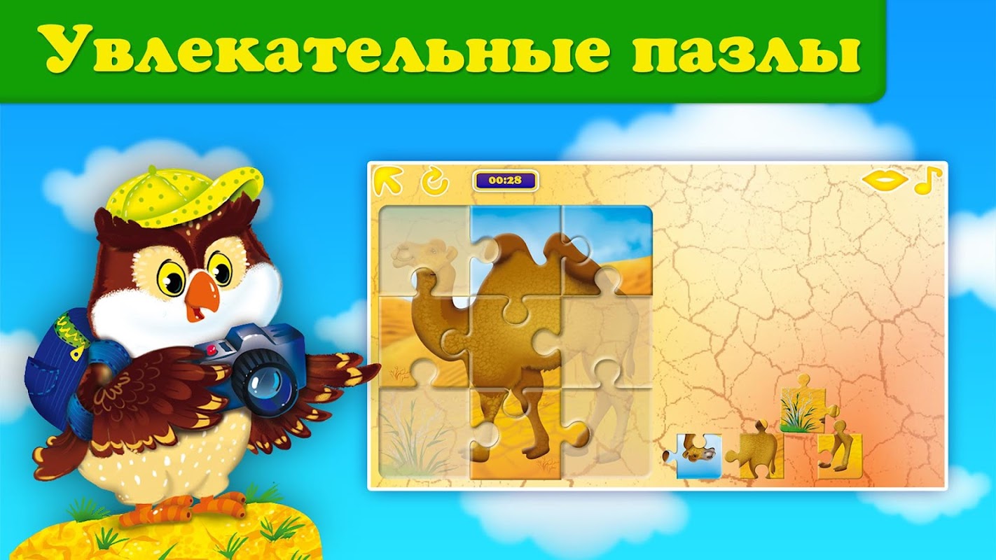 Увлекательная развивающая игра для самых маленьких, основанная на серии детских книжек Твой Удивительный Мир. Задача игры – расставлять животных в местах их обитания и собирать из них пазлы. Ребенок запоминает, какие зверюшки живут в лесу, в море, на заснеженных просторах, знакомится с фауной нашей планеты и познает ее удивительный мир. После удачного прохождения уровня на экране появляются праздничные шары и поощрительные аплодисменты. Удача вдохновляет малыша на продолжение игры. Каждый уровень сопровождается веселой мелодией, а при клике на животное произносится его название. Так ребенок учится говорить, узнает новые слова. Всего в игре 20 пазлов и 7 картинок, куда нужно вставить фигурки животных.