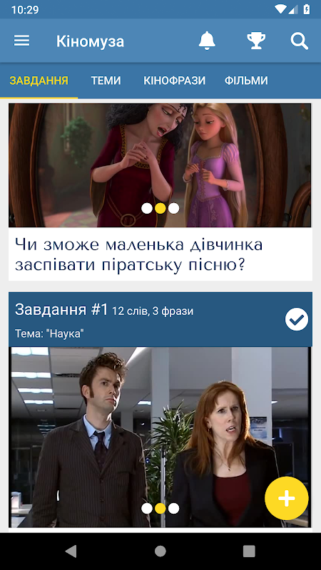 প্রতি দিন একটি নতুন কাজ: সিনেমা থেকে শব্দ, বাক্যাংশ এবং snippets, প্রশিক্ষণ উচ্চারণ।
