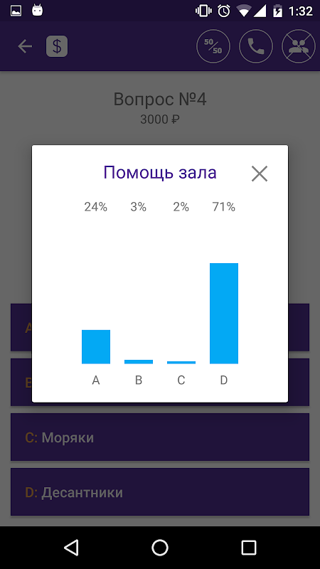 Ответьте на 15 вопросов разной сложности на пути к победе. Можно использовать три подсказки: «50/50», «Помощь зала» и «Звонок другу».