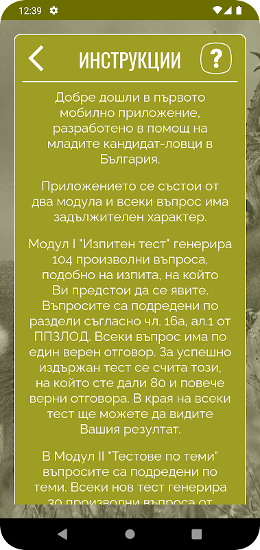 মডিউল I "স্টার্ট পরীক্ষা" 104 এলোমেলো প্রশ্ন উত্পন্ন করে, আপনি যে পরীক্ষায় যাচ্ছেন তার অনুরূপ। প্রশ্নগুলি শিল্প অনুযায়ী বিভাগগুলি দ্বারা সাজানো হয়। 16 এ, পিপিজেডএলওডের প্যারা 1। প্রতিটি প্রশ্নের একটি সঠিক উত্তর রয়েছে। একটি সফল পরীক্ষা এমন এক হিসাবে বিবেচিত যা আপনি 80 বা তার বেশি সঠিক উত্তর দিয়েছেন। প্রতিটি পরীক্ষা শেষে আপনি নিজের ফলাফল দেখতে সক্ষম হবেন।