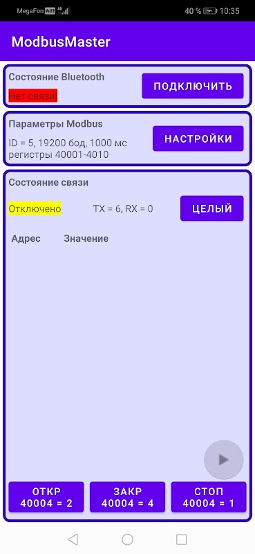 Приложение позволяет в режиме мастера удаленно через Bluetooth подключиться к любому устройству по протоколу Modbus RTU. Для этого еще необходим переходник, который легко реализовать с помощью Arduino и любого другого контроллера. Переходник получает мастер запрос от телефона в виде байтового массива. Ответ от подчиненного устройства преобразуется в HEX-строку и передается обратно в смартфон.