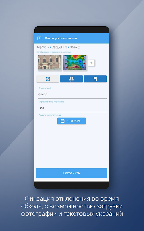 অ্যাপ্লিকেশনটি আপনাকে তিনটি প্রকার অনুসারে নির্বাচিত মেঝেতে দ্রুত বিচ্যুতি রেকর্ড করতে দেয়: