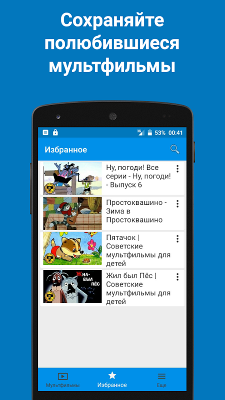 - возможность добавлять полюбившийся вам мультфильм в раздел Избранное