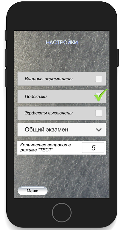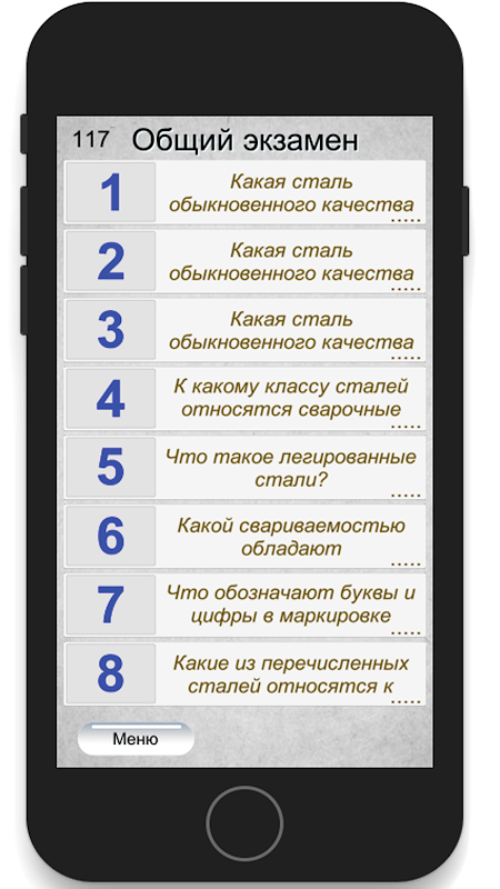 Общий экзамен, 117 шт. Приложение предназначено для самотестирования. Вопросы можно выводить по порядку или перемешать. Режим обучения в разделе (ТЕСТ) - подсказки;