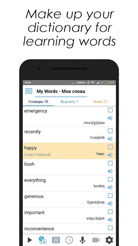 1) My dictionary. This is a free section (Free) where you can increase vocabulary. Learning is easy. Knowing the words you can listen to and understand the interlocutor, it turns out the dialogue. Training is needed daily to quickly learn English.