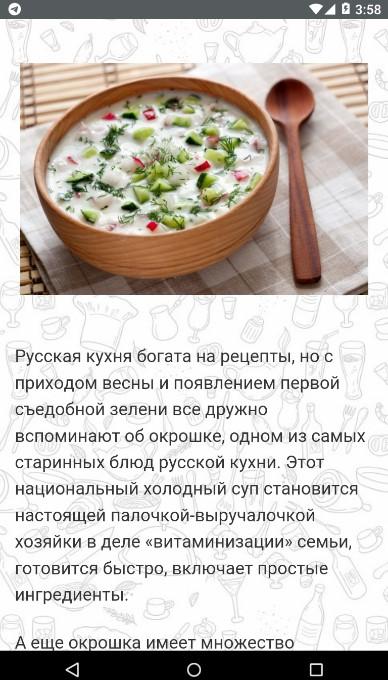 Различные рецепты окрошки собраны в этом бесплатном справочнике. Хотите узнать, как готовится окрошка рецепт классическая с колбасой или как приготовить окрошку по классическим рецептом с мясом поросенка, домашней птицы и дичи? Все придуманные рецепты этого холодного супа собраны в данной энциклопедии. Живительная окрошка на кефире, квасе или заправленная сметаной подробно описаны. С нашим справочником вы все лето будете радовать близких разными вариантами этого представителя классической русской кухни. Первые рецепты окрошки упоминаются еще в «Домострое» 17 века, а более поздние рецепты окрошки мы нашли, упорядочили и с подробным описанием разместили в этом бесплатном справочнике.