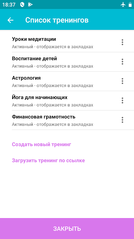 অ্যাপ্লিকেশনটিতে, আপনি যে কোনও ক্ষেত্রে প্রশিক্ষণ এবং উন্নয়ন কর্মসূচির একটি তালিকা তৈরি করতে পারেন - ধ্যান এবং যোগব্যায়াম, প্যারেন্টিং, সাইকোলজি, আর্থিক সাক্ষরতা, ব্যক্তিগত কার্যকারিতা ইত্যাদি in