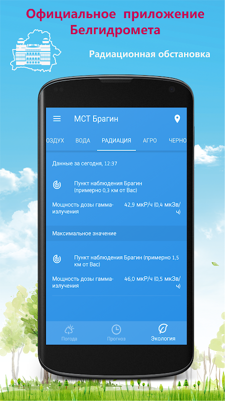 "পকেটে আবহাওয়া" হল অ্যান্ড্রয়েড 4.1 এর জন্য বেলহাইড্রোমেট মোবাইল অ্যাপ্লিকেশন এবং 854x480 এর স্ক্রিন রেজুলেশনের সাথে উচ্চতর।