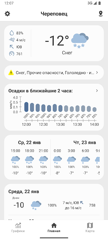 — ভিজ্যুয়াল গ্রাফ সহ সপ্তাহের জন্য আবহাওয়ার পূর্বাভাস, সেইসাথে আগামী দিনের জন্য 3-ঘন্টা বৃদ্ধিতে।