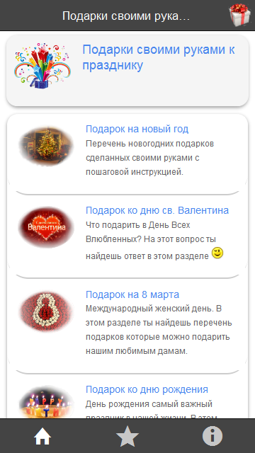 Данное приложение имеет несколько категорий самых распространенных праздников со списком оригинальных подарков (поделок), сопровождающихся пошаговыми инструкциями по их изготовлению в графическом представлении.