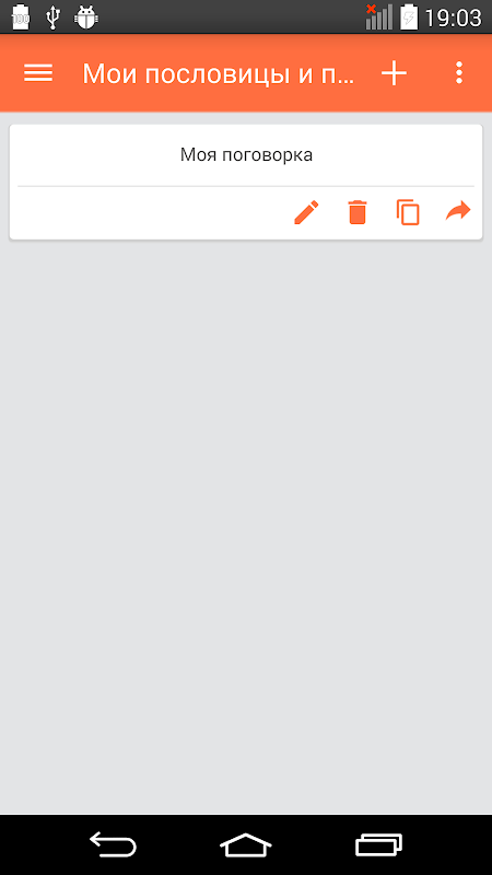 В приложении удобная навигация. Пословицы и поговорки разбиты на категории по тематике и происхождению. Присутствует поиск. В данном приложении предусмотрена возможность добавить любимые пословицы и поговорки в избранное, поделиться с друзьями по почте, смс или соцсети, а так же скопировать. Присутствует раздел "Мои пословицы и поговорки" в который вы можете добавлять пословицы и поговорки которых нет в базе. Так же есть возможность установить закладку на определенной пословице или поговорке, что бы затем вернуться к чтению с того же места.