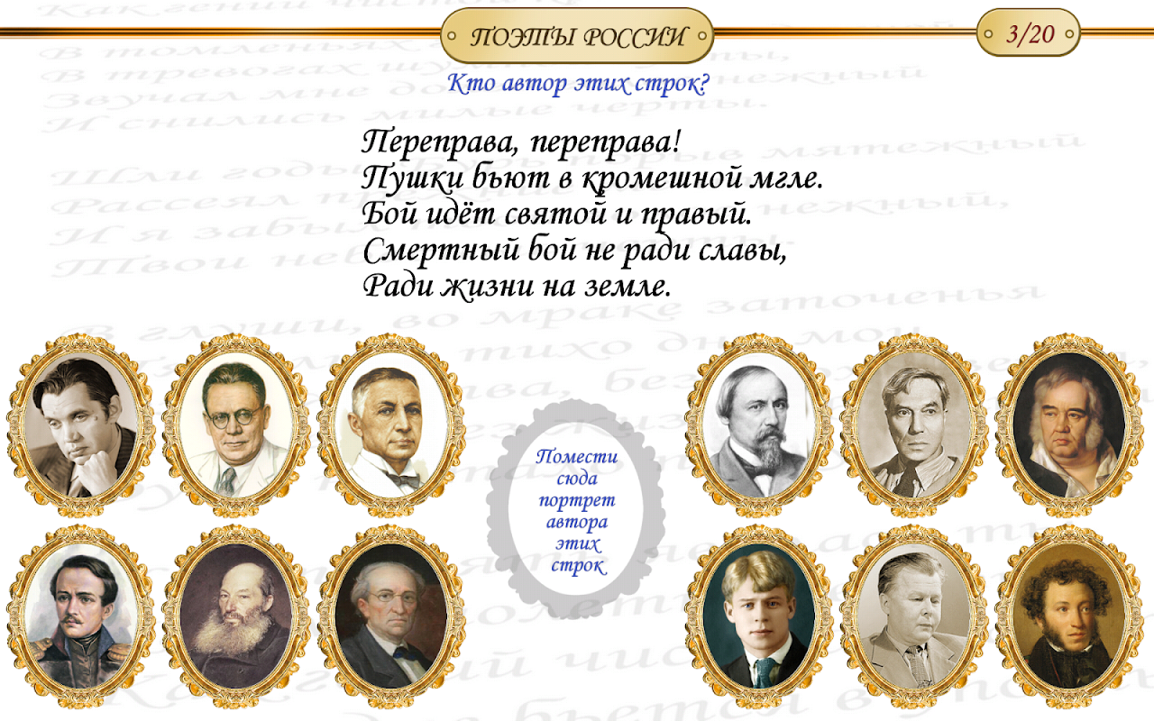 কি কবি আপনি রাশিয়ান জানেন? উচ্চ বিদ্যালয় থেকে কি কবিতা, মনে আছে? আপনি বিভিন্ন সুপরিচিত লাইনের কৃতি জানার পদ্ধতি কী? আপনি কবিতা মুগ্ধ বিশ্বের ভোগ করবে! স্কুলের স্তর নির্বাচন করুন অথবা তার কাজে জটিলতা দেখা, এবং (বিশেষজ্ঞদের জন্য) সম্পূর্ণ তালিকা নির্বাচন করুন. (215 আয়াত মোট বেস আউট) এলোমেলোভাবে জেনারেট 20 টা প্রশ্নের প্রতিটি বৈকল্পিক, তাই প্রতিটি সময় আপনি নতুন কিছু খুঁজে!