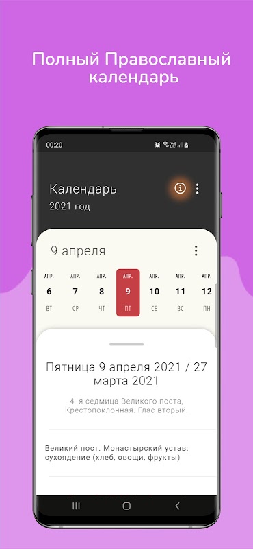 তারিখের পছন্দ সহ অর্থোডক্স ক্যালেন্ডার। ক্যালেন্ডারটি বছর বা মাসে সীমাবদ্ধ নয়। এই অ্যাপ্লিকেশনটির প্রধান সুবিধা হ'ল এটি নিখরচায় এবং বিজ্ঞাপন ছাড়াই। আধুনিক এবং আড়ম্বরপূর্ণ নকশা আপনার ব্যবহারকে আরও উপভোগ্য করে তুলবে।
