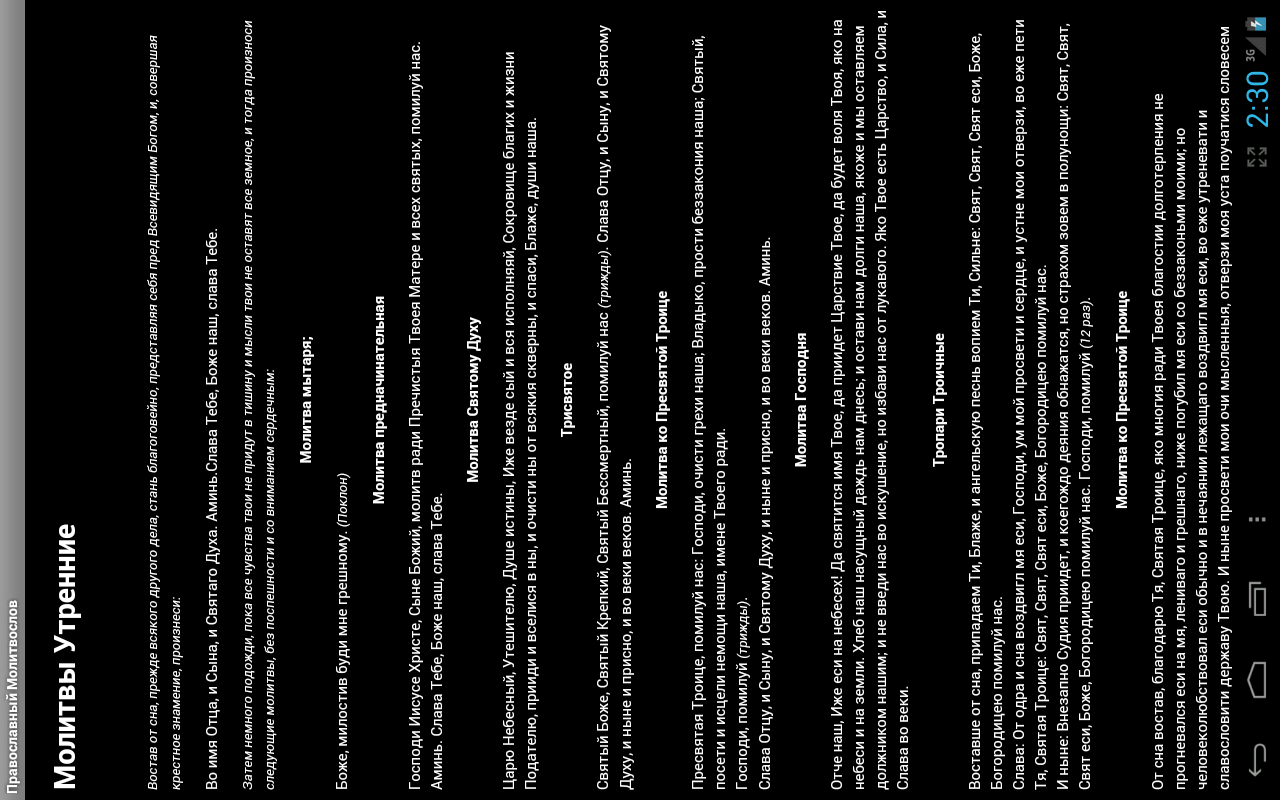 Присутствует ночной режим чтения. Увеличение текста молитв. (Чтобы доступ к этим настройкам нажмите кнопку Menu во время чтения молитвы)