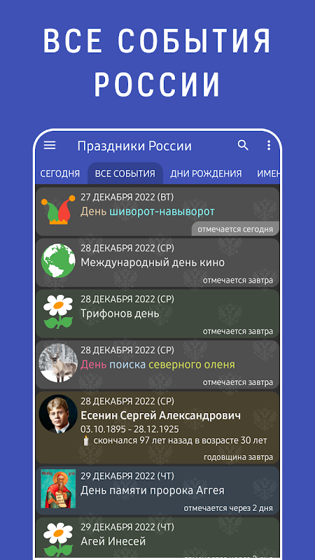 এই অ্যাপ্লিকেশনটিতে রাশিয়ায় উদযাপিত বেশিরভাগ ছুটি এবং স্মরণীয় তারিখগুলির সম্পর্কে সর্বাধিক সম্পূর্ণ তথ্য রয়েছে। অ্যাপ্লিকেশন পরিচিতিগুলির জন্মদিন এবং তাদের নাম প্রদর্শন করে। স্লাভিক, লোক এবং গোঁড়া ক্যালেন্ডার অন্তর্ভুক্ত। ছুটির তালিকা বর্তমান তারিখ অনুসারে সাজানো হয়েছে। তালিকাটি উদযাপনের অনুমোদিত তারিখ, পাশাপাশি এই তারিখ পর্যন্ত বাকি কতগুলি দিন দেখায়। সেটিংসের উপর নির্ভর করে, তালিকাটি চলমান বছরের সংখ্যা সহ পরিচিতিগুলির জন্মদিন দেখায়। অ্যাপ্লিকেশনটিতে উইজেট রয়েছে, যার প্রতিটি আপনার স্বাদে অনুকূলিতকরণ করা যায়। ইভেন্ট সম্পর্কে বিস্তারিত তথ্য পেতে, আগ্রহের তালিকার আইটেমটিতে ক্লিক করুন। এই ডেটা আমদানি ও সংরক্ষণের ক্ষমতা সহ অ্যাপ্লিকেশনটিতে আপনার ইভেন্টগুলি যুক্ত করার ফাংশন রয়েছে।