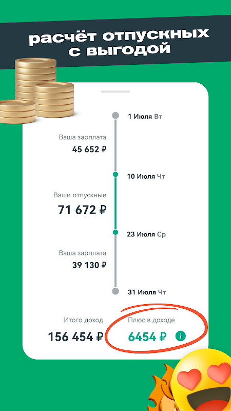 ছুটির বেতনের পরিমাণ, বেতন এবং নিয়মিত আয়ের সাথে পার্থক্য দেখতে আপনাকে কেবল আপনার বেতন এবং প্রত্যাশিত ছুটির তারিখগুলি নির্দেশ করতে হবে। বিভিন্ন তারিখ চেক করুন - সবচেয়ে লাভজনক নির্বাচন করুন!
