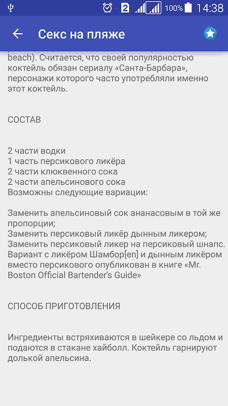 - Избранное и закладки (помечайте интересные статьи звездочкой. Список коктейлей будет отображаться в избранном.)