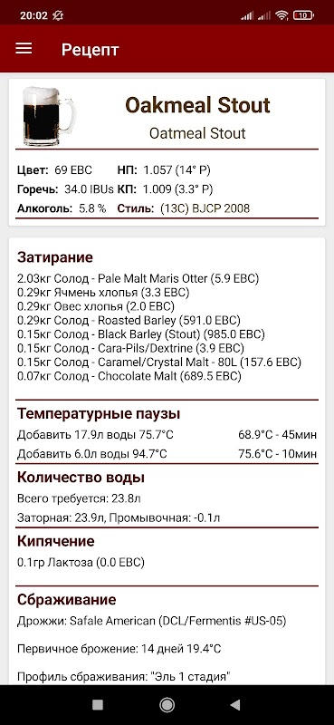 অ্যাপ্লিকেশনটি নির্বাচিত ম্যাশ প্রোফাইল অনুসারে মাল্ট, হপস, অ্যাডিটিভের পরিমাণের পাশাপাশি ম্যাশ এবং ওয়াশ ওয়াটারের পরিমাণ, এর তাপমাত্রা এবং প্রয়োজনীয় তাপীয় বিরতি গণনা করবে।