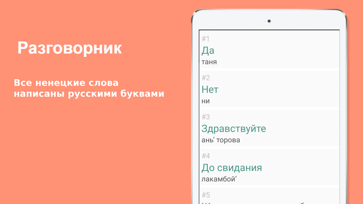 Русско-ненецкий разговорник можно использовать соответственно, как разговорник, так и инструмент для изучения ненецкого языка. Все ненецкие слова написаны русскими буквами и разбиты на 10 логических тем, то есть разговорник рассчитан на русскоговорящего пользователя (туриста).