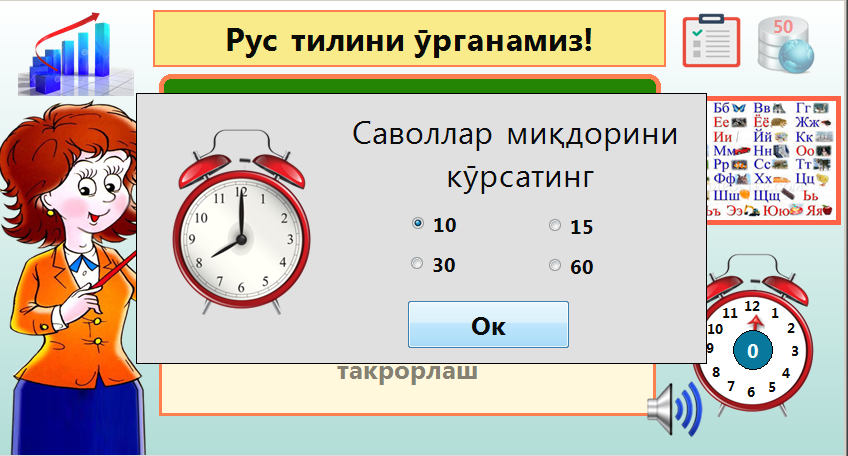 Rus tilini ўynab үrganamiz! উশবু দস্তুর ওরকালি সিজ রুস তিলিদাগি কুপগিনা সুজলারনি ওয়নব উরগনাসিজ! দস্তুর ঝুদা হাম জাভকলি বলিব সিজনি তিল উরগানিশ ইশতিওকিংজিনি ওশিরিব ইউবোরাদি। শুনিংদেক দস্তুরদা রেটিং সিস্টেমসি উর্নাতিলগান। বু জীবন ব্যবস্থা ইলমিংজিনি নাজোরাত কিলিশ ওয়া বালান্দ কুতারিশ উচুন ঘুদা হাম ইয়ারদাম বেরদি। সাভোলার বেসিদা আভালিগা 50 সাভোল বুলিব, ইয়াঙ্গি সাভোলার্নি қӯশিশ উচুন সিজ ҳech বলমাসা 3 মার্চ 100% তুলিক ঝাভোব বেরিশিংিজ কেরাক। Ҳhar davrda 50 tadan savollar қӯশিলিব বেরাভেরাদি va umumiy savollar soni to 1000 қadar etib boradi. বিজ ইশোনামিজকি বিজনিং দস্তুরিমিজ সিজলরগা ঘুদা হাম মকুল বুলাদি ওয়া ইয়াঙ্গি ইয়াঙ্গি শাকল্লারিনি তেজ কুনলার্দা সিজলার্গা খাভোলা কিলামিজ ভা সাভোল্লার বাজাসিনি থেকে 5000 -হা ইতকাজামিজ, দেগান উমিদ্দামিজ!